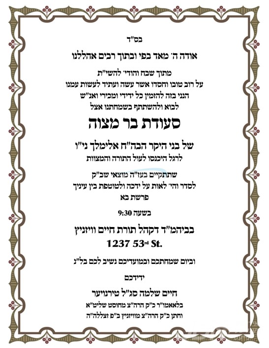 היינט קומט פאר די שמחת הבר מצוה פון א זון ביי הגה"צ ר' חיים שלמה טירנויער שליט"א מו"ץ בק"ק וויזניץ אין בארא פארק, זון פון כ"ק אדמו"ר מחוסט שליט"א פון וומס"ב, און איידעם ביי כ"ק הרה"צ בעל אור שלום מוויזניץ זצ"ל. - די שמחה קומט פאר אין וויזניצע בית המדרש אין בארא פארק.