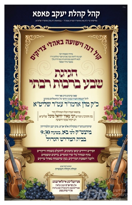 שמחת בית פאפא: היינט קומט פאר די שמחת השבע ברכות פון א אייניקל ביי כ"ק אדמו"ר מפאפא שליט"א, די כלה א טאכטער פון זיין איידעם הגה"צ ר' מאיר יחיאל מיכל דייטש שליט"א אבד"ק מעייני הישועה מאנסי, זון פון הגה"צ ר' יחזקאל דייטש שליט"א אבד"ק מקור חיים, מיט די חתן א זון פון הגה"צ ר' משה מנחם זעגעלבוים שליט"א אבד"ק אלכסנדר וומס"ב, זון פון הגה"צ ר' ליפא זעגעלבוים שליט"א מוויען, און איידעם ביי הגה"צ ר' סיני האלבערשטאם שליט"א אדמו"ר מצאנז וומס"ב. – די שמחת השבע ברכות קומט פאר אין ביהמ"ד הגדול פאפא אין וויליאמסבורג.