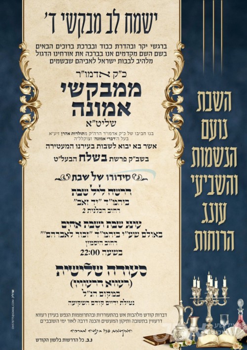 כ"ק אדמו"ר ממבקשי אמונה שליט"א איז צוגאסט אויף דעם שבת אין שטאט חדרה, די טישן וועלן פארקומען אין זאל פון ביהמ"ד זכור לאברהם.