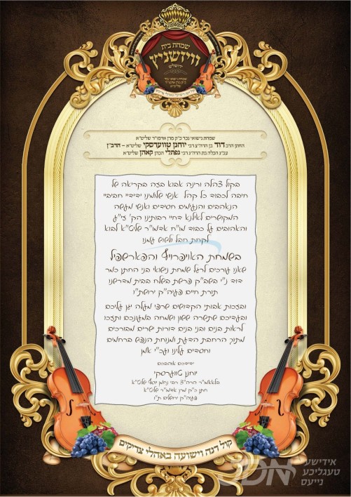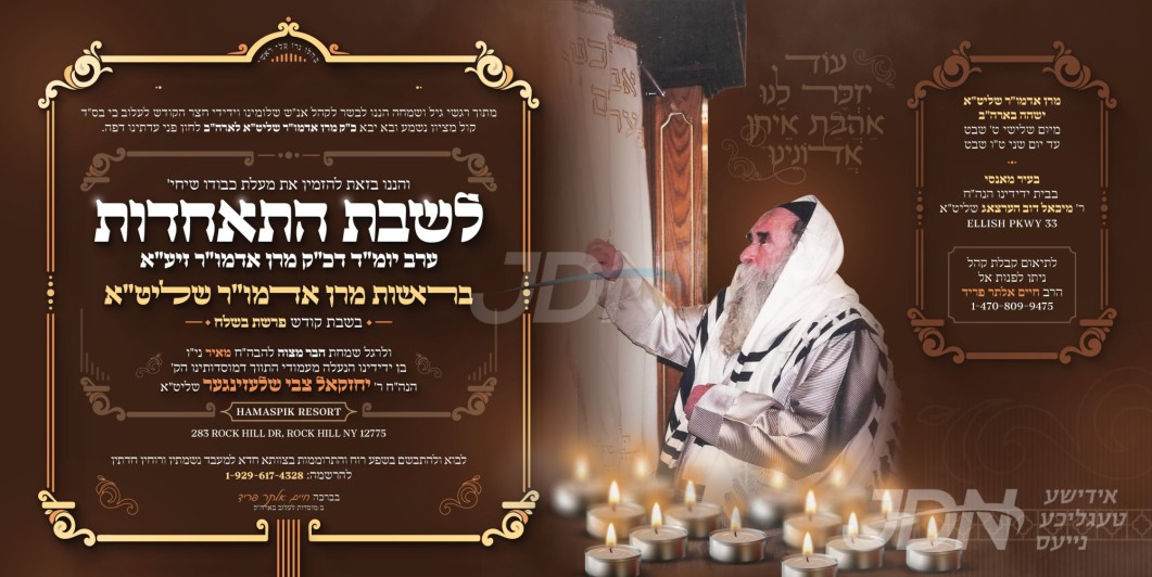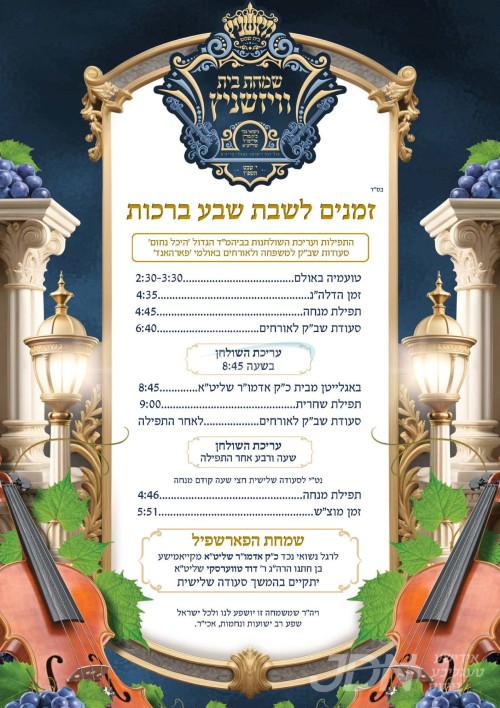 שמחת בית תולדות אברהם יצחק – מעליץ – טעמעשוואר: דעם שבת קומט פאר די שמחת השבע ברכות פונעם חתן א זון פון הגה"צ ר' לוי יצחק לייפער שליט"א אבד"ק טעמעשוואר טשעסנאט רידזש, זון פון כ"ק אדמו"ר מטעמעשוואר ב"פ זצ"ל, און איידעם ביי הגה"צ ר' ברוך ראזענבוים שליט"א אבד"ק נאנאש וומס"ב, מיט די כלה א טאכטער פון הגה"צ ר' משה הורוויץ שליט"א אבד"ק אור נפתלי פערל ריווער אין מאנסי, זון פון כ"ק אדמו"ר ממעליץ שליט"א, און איידעם ביי כ"ק אדמו"ר מתולדות אברהם יצחק שליט"א. – די שמחת השבע ברכות קומט פאר אין ביהמ"ד אור נפתלי אין די פערל ריווער געגנט אין מאנסי.