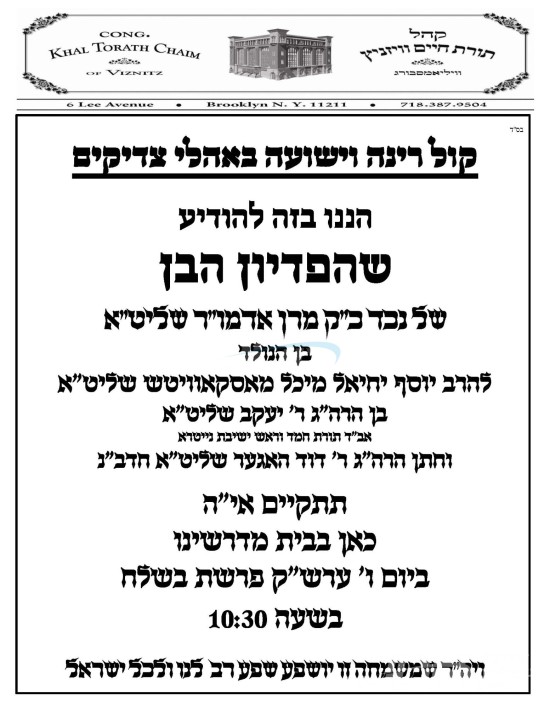 היינט קומט פאר די שמחת פדיון הבן פון א אור אייניקל ביי כ"ק אדמו"ר מוויזניץ שליט"א פון וויליאמסבורג, אייניקל פון זיין איידעם הגה"צ ר' דוד האגער שליט"א, זון פון כ"ק אדמו"ר מוויזניץ שליט"א פון קייאמישע, בן הנולד ביי זיין איידעם הרב יוסף יחיאל מיכל מאסקאוויטש שליט"א, זון פון הגה"צ ר' יעקב מאסקאוויטש שליט"א אבד"ק תורת חמד נייטרא וומס"ב, זון פון הגה"צ ר' יצחק אלעזר מאסקאוויטש שליט"א משאץ, און איידעם ביי כ"ק אדמו"ר מקאלוב שליט"א. – די שמחה קומט פאר אין וויזניצע בית המדרש אין וויליאמסבורג.