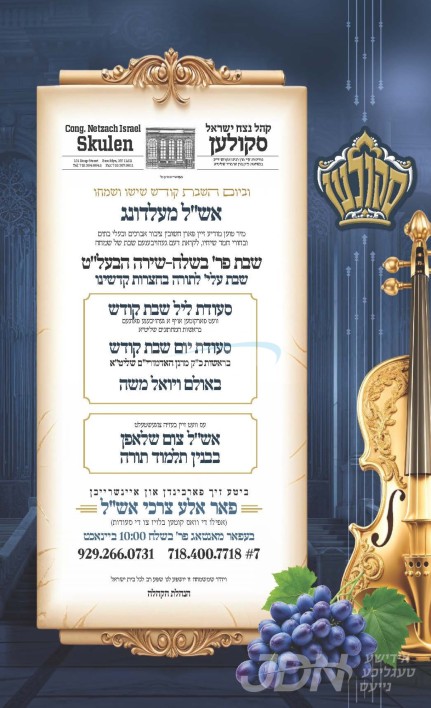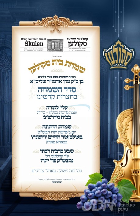 שמחת בית סקולען – טשערנאביל: דעם שבת קומט פאר די שמחת האויפרוף פונעם חתן א זון פון כ"ק אדמו"ר מישועת יעקב סקולען שליט"א, איידעם ביי כ"ק אדמו"ר מטשערנאביל שליט"א, מיט די כלה א טאכטער פון הגה"צ ר' יעקב יוסף פיש שליט"א ר"ם בישיבה קטנה אמרי חיים וויזניץ ב"פ, זון פון כ"ק אדמו"ר מביקסאד שליט"א, און איידעם ביי כ"ק הגה"צ בעל אור שלום מוויזניץ זצ"ל. – די שמחת האויפרוף קומט פאר אין ביהמ"ד נצח ישראל סקולען אין וויליאמסבורג. דער פעטער כ"ק אדמו"ר מסקולען שליט"א איז צוגאסט אויף שבת אין וויליאמסבורג לכבוד די שמחה, און וועט אפרעכטן די תפילות און טישן אינאיינעם מיטן ברודער דער בעל שמחה כ"ק אדמו"ר מישועת יעקב סקולען שליט"א.