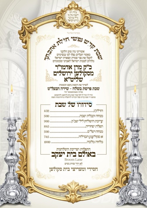 כ"ק אדמו"ר מסקולען שליט"א פון ירושלים איז צוגאסט אויף דעם שבת אין מאנטשעסטער, די תפילות און טישן קומען פאר אין זאל פון בית יעקב, די אכסניא איז אין שטוב פון הנגיד החסיד ר' משה צבי ראטבארד הי"ו.