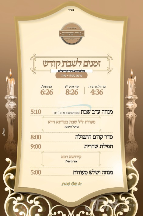 דעם שבת קומט פאר די שמחת השבע ברכות פונעם חתן א זון פון כ"ק אדמו"ר מזידטשויב מארין פארק שליט"א, זון פון כ"ק אדמו"ר מזידטשויב שיקאגא זצ"ל, און איידעם ביי הגה"צ אבד"ק פרעמישלאן פלעטבוש זצ"ל, מיט די כלה א טאכטער פון כ"ק אדמו"ר מקאלאמייא שליט"א, זון פון כ"ק אדמו"ר מסאסרעגען זצ"ל, און איידעם ביי כ"ק אדמו"ר מצאנז זצ"ל פון בארא פארק. – די שמחת השבע ברכות קומט פאר אין ביהמ"ד קאלאמייא אין לינדען.