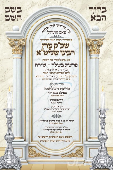 שמחת בית תולדות אהרן – לעלוב: דעם שבת קומט פאר די שמחת השבע ברכות פון א אייניקל ביי כ"ק אדמו"ר מתולדות אהרן שליט"א, די כלה א טאכטער פון זיין איידעם הגה"צ ר' אברהם ראבינאוויטש שליט"א, זון פון הגה"צ ר' יהושע אשר ראבינאוויטש שליט"א אדמו"ר מזעליחוב וראש ישיבת משכנות הרועים, מיט די חתן א זון פון הגה"צ ר' אפרים שלמה בידערמאן שליט"א, זון פון כ"ק אדמו"ר מלעלוב שליט"א פון בני ברק, און איידעם ביי הגה"צ ר' דוד טווערסקי שליט"א אבד"ק ראחמיסטריווקא ירושלים. – די שמחת השבע ברכות קומט פאר אין ביהמ"ד הגדול תולדות אהרן אין ירושלים.