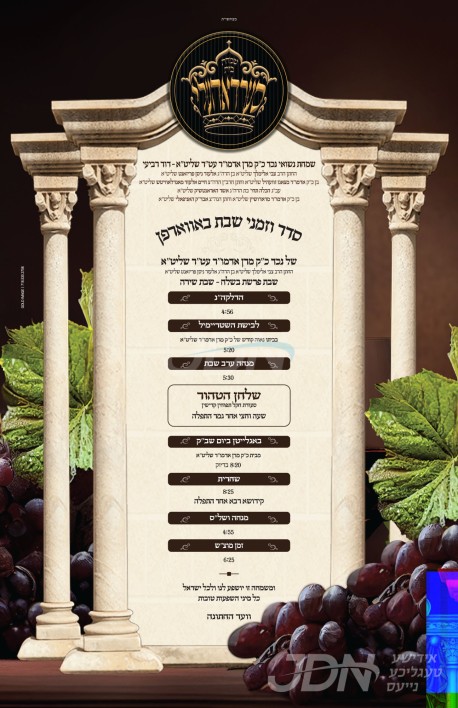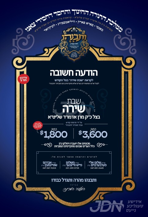 דעם שבת קומט פאר די שמחת האויפרוף פונעם חתן א זון פון הגה"צ ר' ישראל יעקב רובין שליט"א, זון פון הגה"צ ר' יצחק טובי' רובין זצ"ל מציעשנוב, און איידעם ביי הגה"צ ר' ירחמיאל זינגער שליט"א, זון פון כ"ק אדמו"ר מאלכסנדר זצ"ל, מיט די כלה א טאכטער פון הגה"צ ר' יואל לוי יצחק גרינוואלד שליט"א, זון פון הגה"צ אבד"ק טעטש זצ"ל, און איידעם ביי הגה"צ גאב"ד אודווארי שליט"א. – די שמחת האויפרוף קומט פאר אין היכל התורה נועם אלימלך ליזענסק אין בארא פארק.