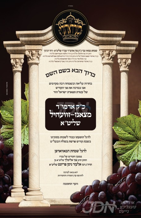שמחת בית וויזניץ: דעם שבת קומט פאר די שמחת האויפרוף פון א אייניקל ביי כ"ק אדמו"ר מוויזניץ שליט"א פון לאנדאן, די חתן א זון פון זיין זון הגה"צ ר' חיים מאיר האגער שליט"א, איידעם ביי כ"ק אדמו"ר מנצח מנחם ספינקא שליט"א, מיט די כלה א טאכטער פון זיין פעטער הגה"צ ר' דוד צבי כהנא שליט"א, זון פון כ"ק אדמו"ר מספינקא לאנדאן זצ"ל, און איידעם ביי הגה"צ אבד"ק ראחמיסטריווקא מאנסי שליט"א. – די שמחת האויפרוף קומט פאר אין ביהמ"ד הגדול וויזניץ אין מאנסי. – דער זיידע כ"ק אדמו"ר מוויזניץ שליט"א פון לאנדאן איז צוגאסט אויף שבת אין מאנסי לכבוד די שמחה, און וועט אפרעכטן די תפילות און טישן אינאיינעם מיט אחיו הגדול כ"ק אדמו"ר מוויזניץ שליט"א פון מאנסי.
