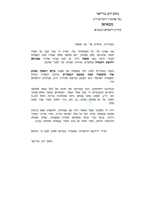 שמחת בית באיאן: היינט קומט פאר די שמחת הבר מצוה פון א אייניקל ביי כ"ק אדמו"ר מבאיאן שליט"א, א זון פון זיין זון הגה"צ ר' אברהם יהושע העשיל ברייאר שליט"א, איידעם ביי הגה"צ ר' אליעזר ארנסטר שליט"א אבד"ק מאור חיים צפת. – די שמחה קומט פאר אין ביהמ"ד הגדול באיאן אין ירושלים, אינאיינעם מיטן שולה"ט לכבוד חמשה עשר בשבט.