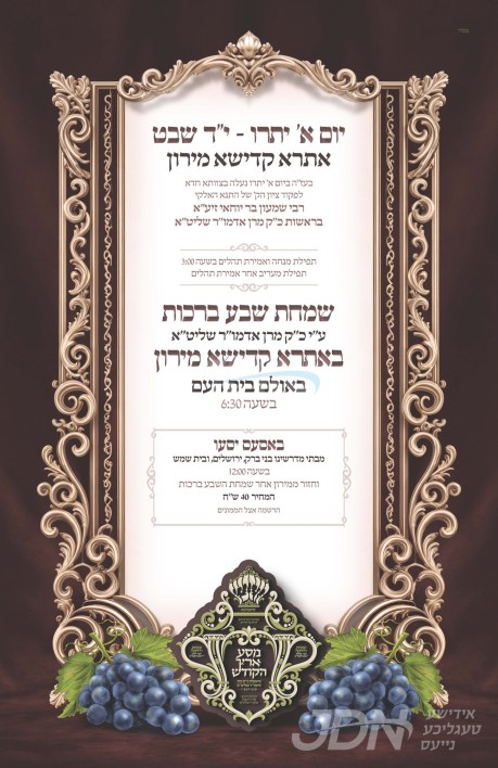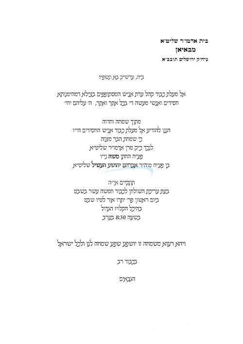 היינט קומט פאר די שמחת החתונה פונעם חתן א זון פון הרב חיים בערגער שליט"א, זון פון הגה"צ אבד"ק מישקאלץ שליט"א, און איידעם ביי הגה"צ ר' יהושע העשיל ראזנער שליט"א מטערצאל, מיט די כלה א טאכטער פון הגה"צ ר' אהרן ראטטענבערג שליט"א אבד"ק שמע שלמה קאזעווע, זון פון כ"ק אדמו"ר מקאזעווע שליט"א, און איידעם ביי כ"ק אדמו"ר מחוסט וומס"ב שליט"א.