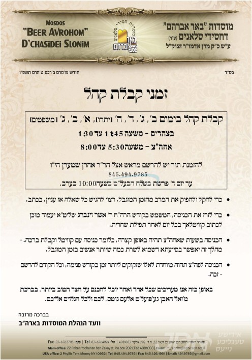 כ"ק אדמו"ר מסלאנים שליט"א לאזט זיך היינט ארויס אויף א מסע הקודש קיין ניו יארק, צו באזוכן בקרב חסידיו ווי יאר יערליך, די קומענדיגע וואך וועט זיך דער רבי שליט"א אויפהאלטן אין שטאט מאנסי, און דאווענען די תפילות בבית מדרשו אויף פיליס טערעס.