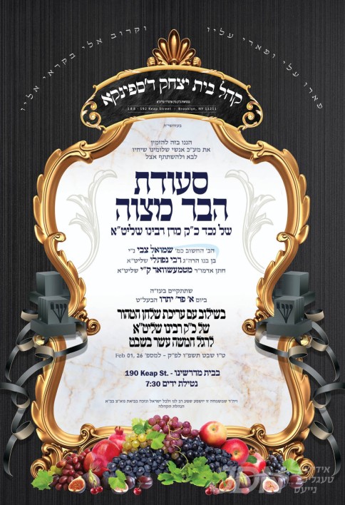 היינט קומט פאר די שמחת הבר מצוה פון א אייניקל ביי כ"ק אדמו"ר מבית יצחק ספינקא שליט"א, א זון פון זיין זון הרב נפתלי הורוויץ שליט"א, איידעם ביי כ"ק אדמו"ר מטעמעשוואר קרית יואל שליט"א. – די שמחה קומט פאר אין ספינקא בית המדרש אויף קיעפ סטריט אין וויליאמסבורג, אינאיינעם מיטן שולה"ט לכבוד חמשה עשר בשבט.