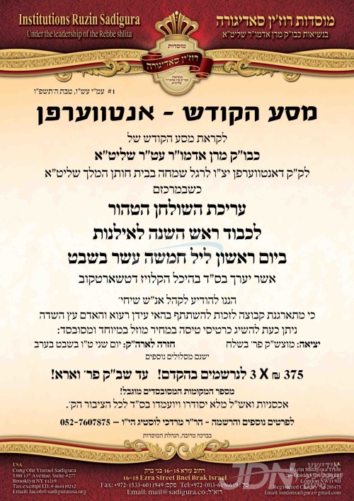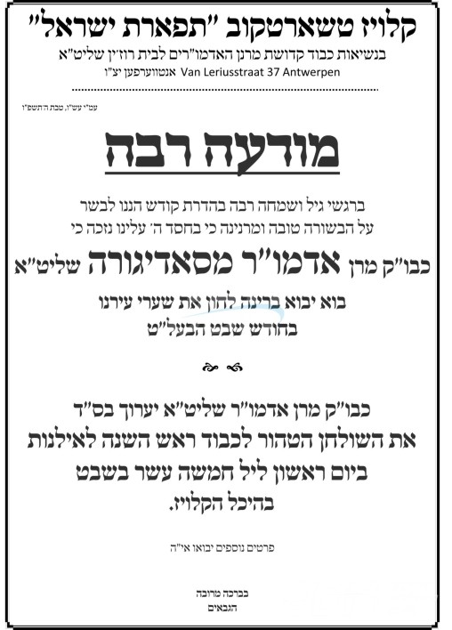 כ"ק אדמו"ר מסאדיגורא שליט"א וועלכער איז צוגאסט די טעג אין אנטווערפן לרגל א משפחה שמחה, וועט היינט אויפדערנאכט אפרעכטן שולחנו הטהור לכבוד חמשה עשר בשבט, אין די טשארטקובער קלויז אין אנטווערפן.