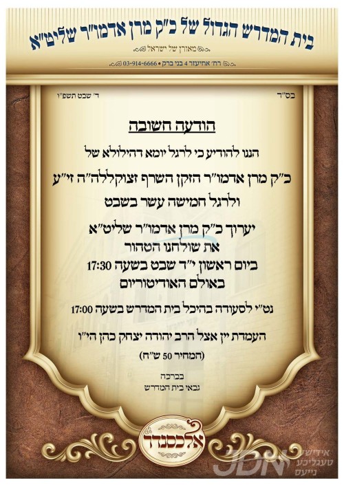 כ"ק אדמו"ר מאלכסנדר שליט"א וועט היינט אויפדערנאכט אפרעכטן די יארצייט טיש לרגל די הילולא קדישא פון זקינו הרה"ק רבי יחיאל מאלכסנדר זי"ע, אינאיינעם מיטן שולה"ט לכבוד חמשה עשר בשבט, אינעם גרויסן אודיטוריום אין בני ברק.