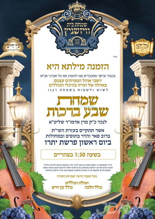 שמחת בית וויזניץ: היינט קומט פאר די שמחת השבע ברכות בחצרות וויזניץ, די חתן א אייניקל פון כ"ק האדמורי"ם מוויזניץ, וויזניץ פון קייאמישע און פון בית שמש שליט"א. - די שמחת השבע ברכות קומט פאר אין ביהמ"ד הגדול וויזניץ אין בית שמש, צוגעשטעלט דורך די כוללי אברכים אין די קהילה.