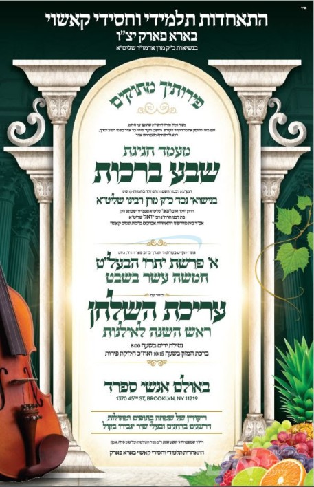 שמחת בית קאשוי: היינט קומט פאר די שמחת השבע ברכות פון א אייניקל ביי כ"ק אדמו"ר מקאשוי שליט"א, די חתן א זון פון זיין זון הגה"צ ר' יואל בלום שליט"א אב"ד ברכת שמים קאשוי מאנסי, איידעם ביי הגה"צ ר' יהודה כ"ץ שליט"א אבד"ק ויצב אברהם מעלבארן, מיט די כלה א טאכטער פון הגה"צ ר' אשר מאנן שליט"א דומ"ץ סאטמאר מוירטל. – די שמחת השבע ברכות קומט פאר אין זאל אנשי ספרד אין בארא פארק, אינאיינעם מיטן שולה"ט לכבוד חמשה עשר בשבט.