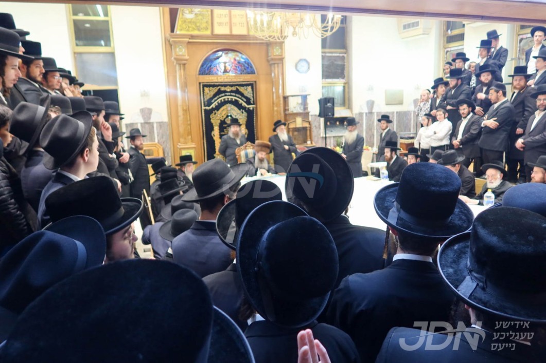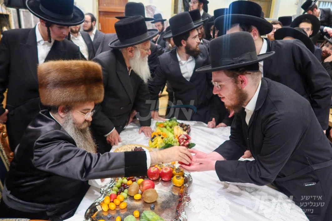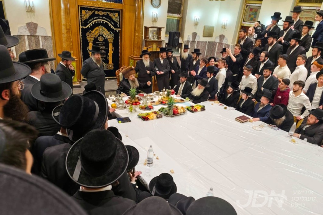 האדמו"ר מוויזניץ ביים טיש חמשה עשר בשבט מיט האחים האדמורי"ם מוויזניץ קייאמישע און וויזניץ בית שמש, אינאיינעם מיטן שמחת השבע ברכות בחצר הקודש וויזניץ