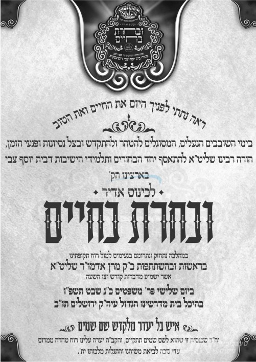 היינט קומט פאר די כינוס ובחרת בחיים פאר אלע תלמידי הישיבות דחסידי דושינסקיא בארץ הקודש, אינעם גרויסן היכל ביהמ"ד אין ירושלים עיה"ק, אין שפיץ פון כ"ק אדמו"ר מדושינסקיא שליט"א.