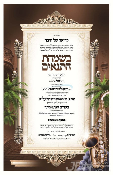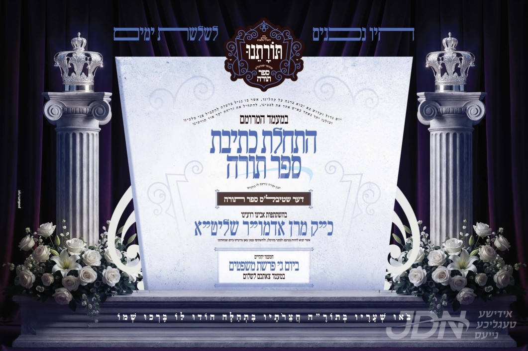 שמחת בית סאטמאר – דושינסקיא: היינט קומט פאר די שמחת התנאים פון א אייניקל ביי כ"ק אדמו"ר מסאטמאר שליט"א, די חתן א זון פון זיין איידעם הגה"צ ר' דוד דוב דושינסקיא שליט"א רב ביהמ"ד אהל פיגא אין קרית יואל, זון פון כ"ק אדמו"ר מדושינסקיא שליט"א, מיט די כלה א טאכטער פון הגה"צ ר' יחזקאל דוד זינגער שליט"א, זון פון הגה"צ ר' שמואל צבי זינגער שליט"א מאלכסנדר, און איידעם ביי הגה"צ ר' יקותיאל טייטלבוים שליט"א, אור אייניקל פון כ"ק אדמו"ר מטשענסקאוויץ פאקשעוויץ שליט"א. – די שמחה קומט פאר אין זאל גינת אסתר אין וויליאמסבורג.