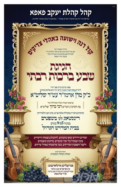 שמחת בית פאפא: היינט קומט פאר די צענטראלע שמחת השבע ברכות פון א אייניקל ביי כ"ק אדמו"ר מפאפא שליט"א, די כלה א טאכטער פון זיין איידעם הגה"צ ר' ברוך רובין שליט"א, זון פון כ"ק אדמו"ר מסוליצא שליט"א, מיט די חתן א זון פון הגה"צ ר' אלישע סעקולא שליט"א אבד"ק סאדאוונא, איידעם ביי כ"ק אדמו"ר מסטריזוב שליט"א. – די שמחת השבע ברכות קומט פאר אין ביהמ"ד הגדול פאפא אין וויליאמסבורג.
