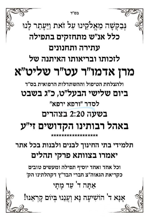 אידישע קינדער בכל מקומות מושבותיהם זענען ווידער מתפלל היינט דינסטאג לרפואת כ"ק אדמו"ר מוויזניץ שליט"א לרפואה שלימה, וועלכער גייט היינט אריבער נאך א מעדיצינישע באהאנדלונג, מיטן האפענונג אז עס זאל ברענגען די געוואונטשענע רעזולטאטן צו היילן דעם רבי'ן בסייעתא דשמיא, אינעם אהל הק' פון אדמור"י בית וויזניץ אין בני ברק וועט פארקומען היינט נאכמיטאג א מעמד תפילת רבים לרפואתו השלימה פונעם רבי'ן אין שפיץ פון די רבני הקהילה, כלל ישראל איז מתפלל לרפואת כ"ק מרן ישראל בן לאה אסתר בתוך שאר חולי ישראל, והן קל כביר לא ימאס תפילת הרבים.