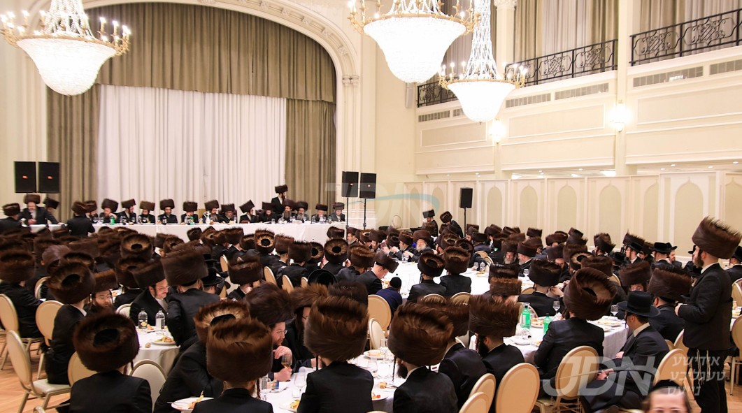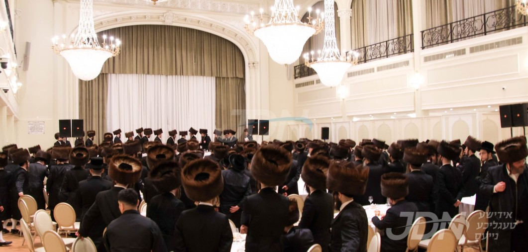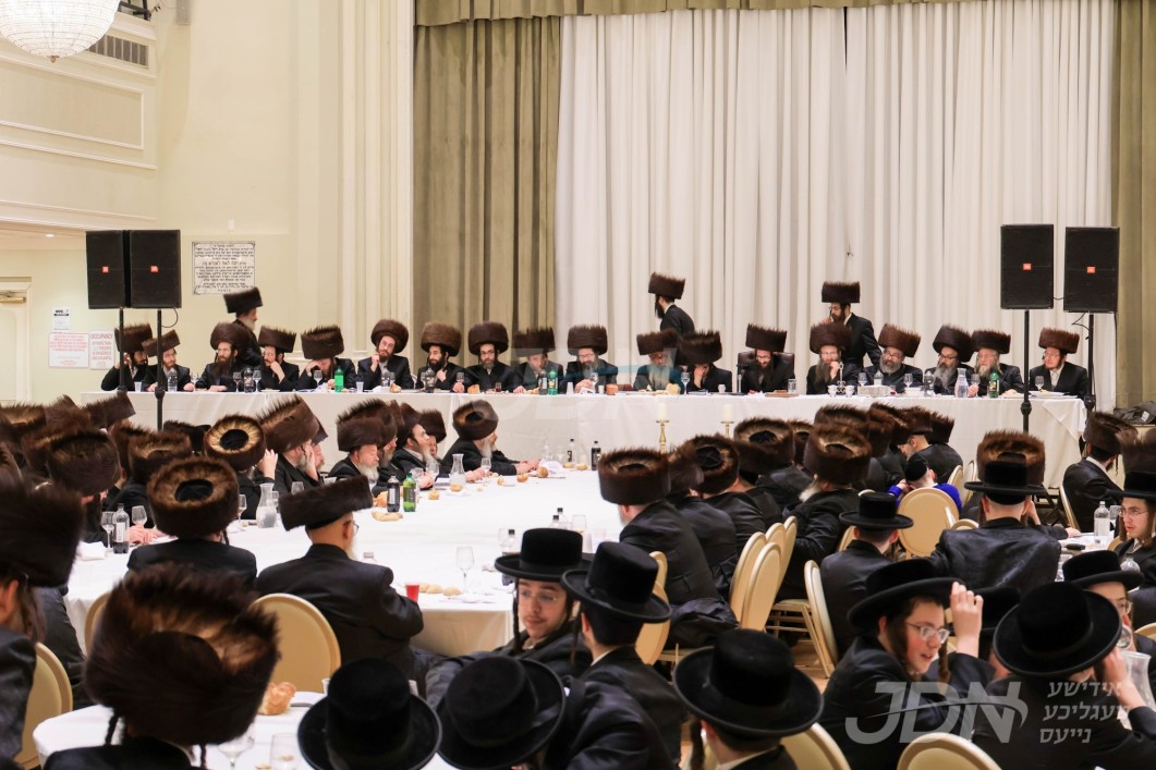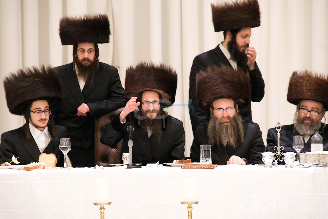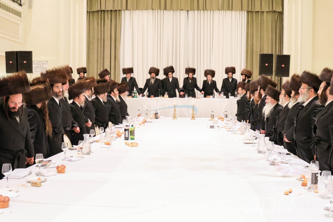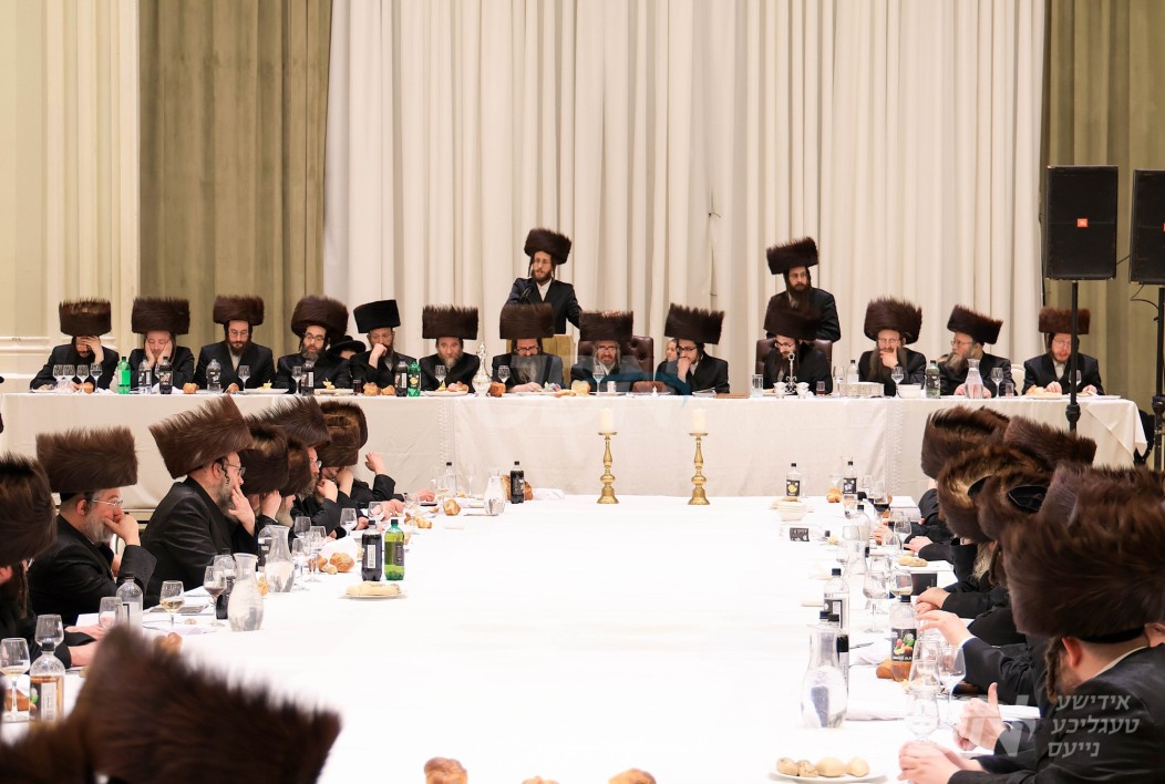 האדמו"ר מוויזניץ ביים טיש חמשה עשר בשבט מיט האחים האדמורי"ם מוויזניץ קייאמישע און וויזניץ בית שמש, אינאיינעם מיטן שמחת השבע ברכות בחצר הקודש וויזניץ