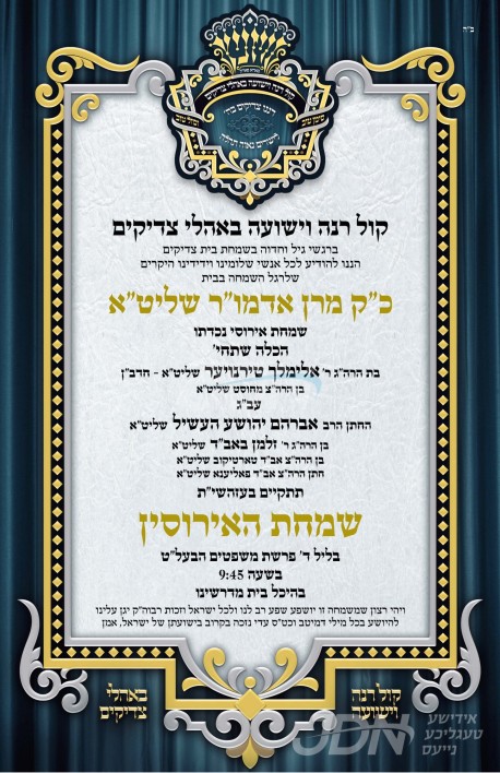 עס איז געשלאסן געווארן די שידוך פונעם חתן א זון פון הרב ישראל שפיטץ שליט"א, זון פון כ"ק אדמו"ר מסערט וויזניץ ארה"ב שליט"א, און איידעם ביי הגה"צ גאב"ד אודווארי שליט"א, מיט די כלה א טאכטער פון הרב ישעי' גרויס שליט"א, זון פון הגה"צ ר' משה גרויס שליט"א מקערעסטיר בערבעשט, און איידעם ביי הגה"צ ר' נפתלי אלימלך אויש שליט"א מוואולקאן.