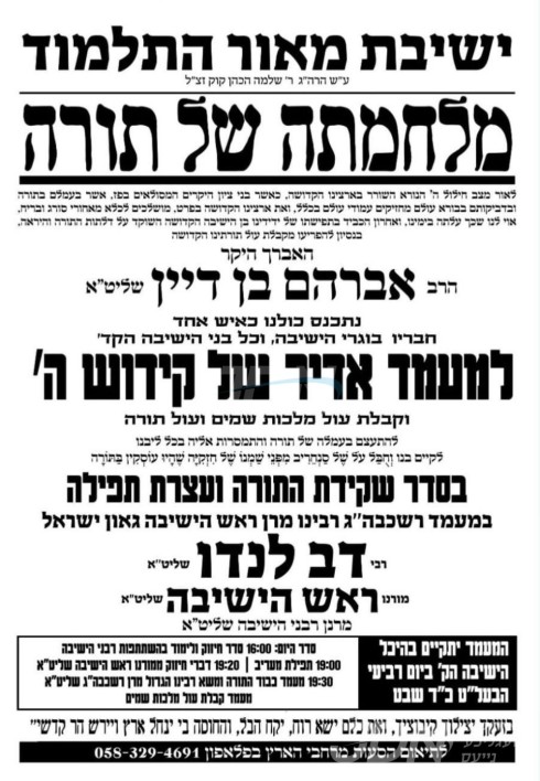 הגאון הגדול רבי דוב לאנדא שליט"א ראש ישיבת סלאבאדקע וועט היינט אנקומען צו ישיבת מאור התלמוד אין רחובות, און אויפטרעטן מיט א חיזוק שמועס ביים עצרת תפילה דורך די תלמידי הישיבה, אין ליכט פון די ארעסט אויף איינער פון די לומדי הישיבה פארן זיך נישט שטעלן צום מדינת ישראל מיליטער.