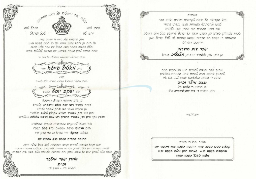 היינט קומט פאר די שמחת החתונה פונעם חתן א זון פון הגה"צ המשפיע ר' יונה זאב וויינבערג שליט"א, איידעם ביי כ"ק אדמו"ר מלעלוב קארלין זצ"ל, מיט די כלה א טאכטער פון הגה"צ ר' אהרן ישעי' מיללער שליט"א, איידעם ביי כ"ק אדמו"ר מהרי"ד מלעלוב זצ"ל. – די שמחת החתונה קומט פאר אין זאל הדקל אין בני ברק.