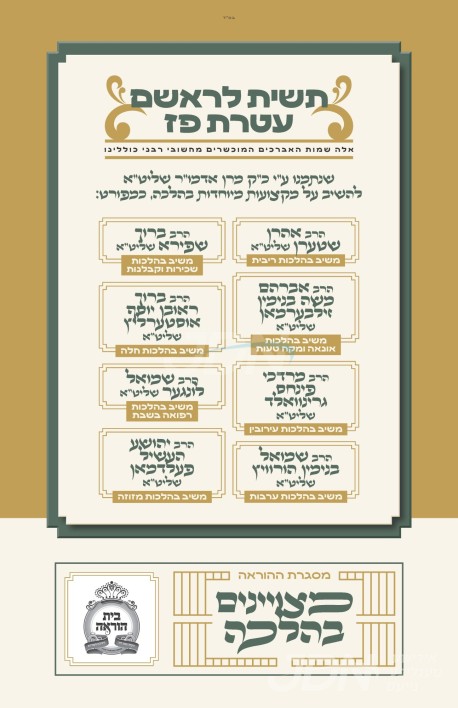 די אכט פרישע דיינים זענען ווי פאלגענד, הרב אברהם משה בנימין זילבערמאן שליט"א - אויף הלכות אונאה ומקח טעות, הרב שמואל בנימין הורוויץ שליט"א – אויף הלכות ערבות, הרב אהרן שטערן שליט"א – אויף הלכות ריבית, הרב ברוך שפירא שליט"א – אויף הלכות שכירות וקבלנות בשבת, הרב מרדכי פינחס גרינוואלד שליט"א – אויף הלכות עירובין , הרב ברוך ראובן יוסף אוסטערליץ שליט"א – אויף הלכות חלה, הרב שמואל לונגער שליט"א – אויף הלכות רפואה בשבת, און הרב יושע העשיל פעלדמאן שליט"א – אויף הלכות מזוזה.
