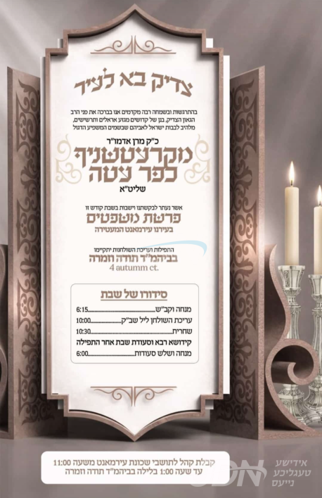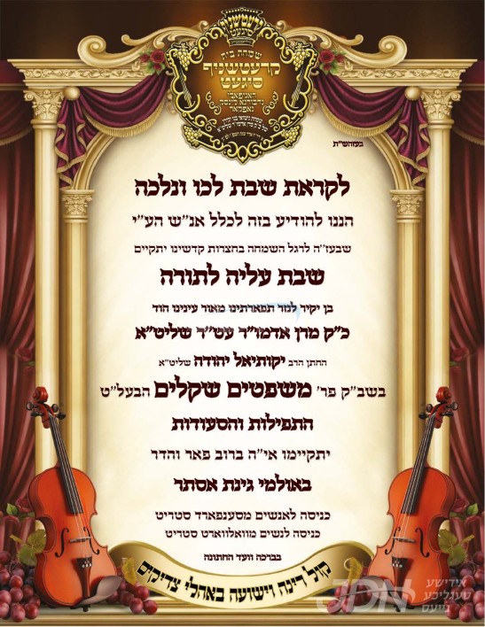 שמחת בית קרעטשניף סיגעט – נדבורנא לינסק: דעם שבת קומט פאר די שמחת האויפרוף פונעם חתן א זון פון כ"ק אדמו"ר מקרעטשניף סיגעט וומס"ב שליט"א, איידעם ביי הגה"צ ר' מאיר שנעעבאלג שליט"א אב"ד האניפאלי, מיט די כלה א טאכטער פון הגה"צ ר' איתמר ראזענבוים שליט"א, זון פון כ"ק אדמו"ר מנדבורנא לינסק שליט"א, און איידעם ביי הגה"צ אב"ד נאפקור שליט"א. – די שמחת האויפרוף קומט פאר אין זאל גינת אסתר אין וויליאמסבורג.