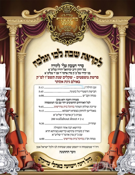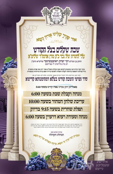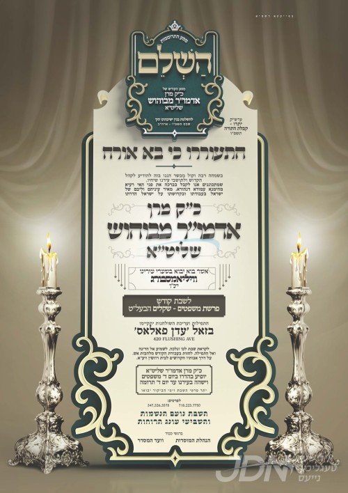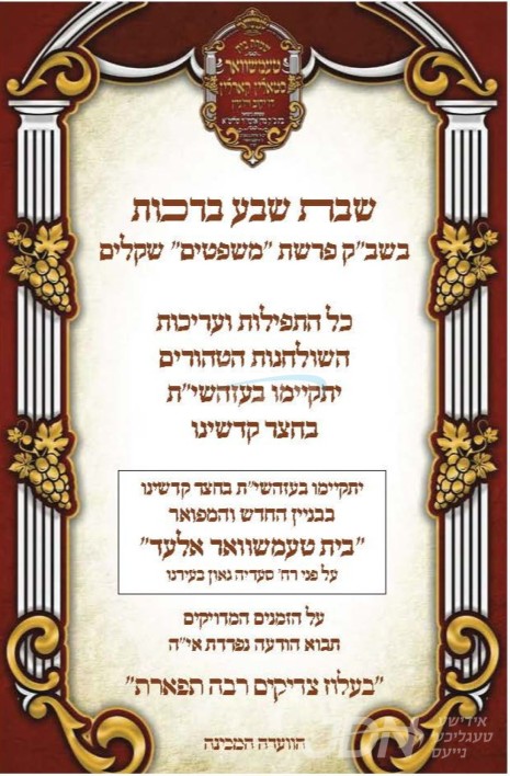 שמחת בית קארלין סטאלין – דזיקוב וויזניץ – טעמעשוואר אלעד: דעם שבת קומט פאר די שמחת השבע ברכות פון א אייניקל ביי כ"ק אדמו"ר מקארלין סטאלין שליט"א, די חתן א זון פון זיין זון הגה"צ ר' יוחנן שוחט שליט"א, איידעם ביי כ"ק אדמו"ר מדזיקוב וויזניץ שליט"א, מיט די כלה א טאכטער פון כ"ק אדמו"ר מטעמעשוואר אלעד שליט"א, איידעם ביי כ"ק אדמו"ר מזוטשקא זצ"ל. – די שמחת השבע ברכות קומט פאר אינעם נייעם טעמעשווארער ביהמ"ד אין אלעד.