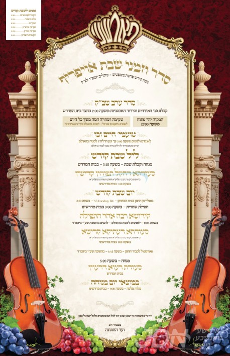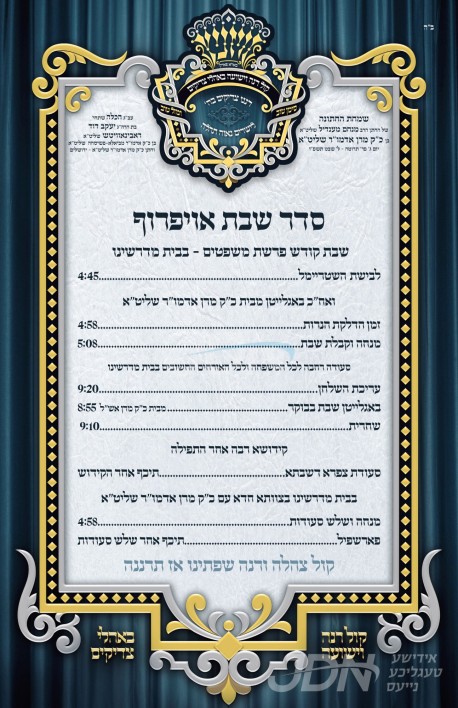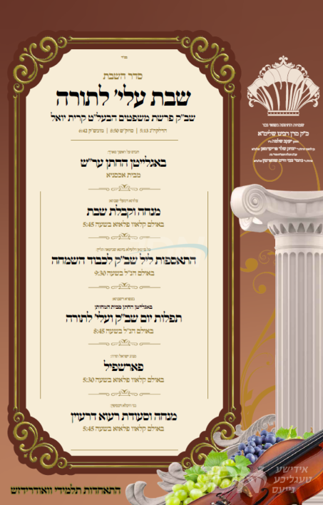 דעם שבת קומט פאר די שמחת האויפרוף פונעם חתן א זון פון הגה"צ ר' שריהו יונה טווערסקי שליט"א אדמו"ר מטריסק מאנטריאל, איידעם ביי הגה"צ ר' יוחנן וואזנער שליט"א ראב"ד סקווירא, מיט די כלה א טאכטער פון הגה"צ ר' שמואל משה דייטש שליט"א, זון פון הגה"צ ר' פרץ טובי' דייטש שליט"א אבד"ק חליסה, און איידעם ביי הגה"צ ר' אהרן שמעון טויב שליט"א אבד"ק קאלוב ב"פ, זון פון כ"ק אדמו"ר מקאלוב שליט"א. – די שמחת האויפרוף קומט פאר אין ביהמ"ד טריסק אין מאנטריאל.