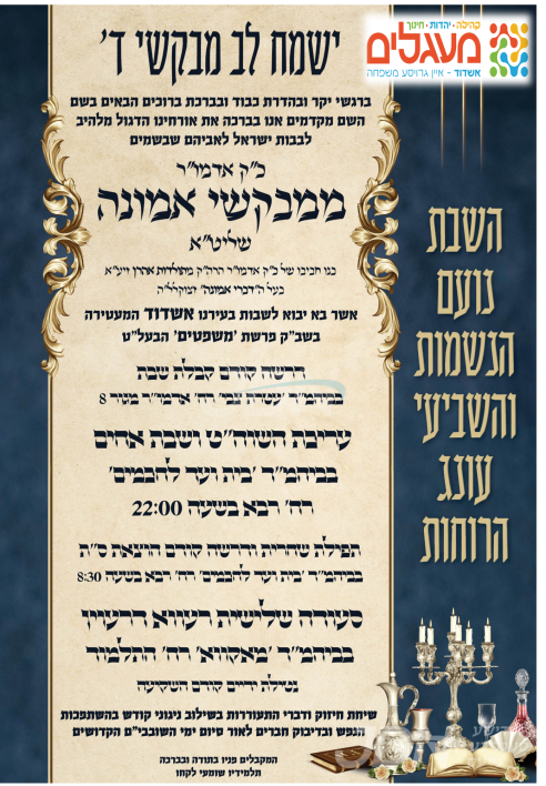כ"ק אדמו"ר ממבקשי אמונה שליט"א איז צוגאסט אויף דעם שבת אין שטאט אשדוד בקרב חסידיו, די תפילות און טישן קומען פאר אין ביהמ"ד בית וועד לחכמים, און שלש סעודות אין ביהמ"ד מאקאווא אויף רחוב התלמוד.