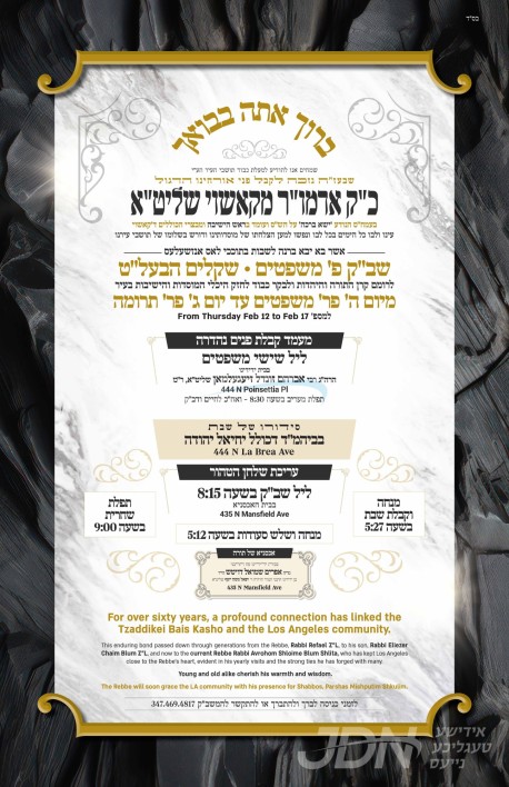 כ"ק אדמו"ר מקאשוי שליט"א איז צוגאסט אויף דעם שבת אין לאס אנדזשעלעס בקרב תושבי העיר ולטובת מוסדותיו הקדושים, די תפילות און טישן קומען פאר אין די חסידישע כולל יחיאל יהודה.