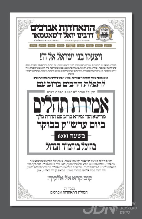 ווי יאר יערליך לסיום ימי השובבי"ם, וועלן פילע אידן זיך צוזאמנעמען היינט פרייטאג פארטאגס באשמורת הבוקר, אויסצוזאגן גאנץ תהלים ברוב עם און מתפלל זיין לישועת הכלל והפרט.