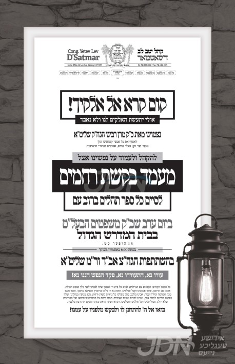 שמחת בית סאטמאר: דעם שבת קומט פאר די שמחת האויפרוף פון א אייניקל ביי כ"ק אדמו"ר מסאטמאר שליט"א, די חתן א זון פון זיין איידעם הגה"צ ר' יצחק ראזענבערגער שליט"א דומ"ץ ביהמ"ד סאטמאר ליע גארדענס, זון פון הגה"צ ר' יהושע ראזענבערגער שליט"א גאב"ד הרמ"א בית שמש וחבר ביד"ץ העדה החרדית, מיט די כלה א טאכטער פון הגה"צ ר' נפתלי מייזליש שליט"א, זון פון הגה"צ אבד"ק אוהעל מאנסי שליט"א, און איידעם ביי כ"ק אדמו"ר משאץ זצ"ל. – די שמחת האויפרוף קומט פאר אין ביהמ"ד הגדול סאטמאר אין וויליאמסבורג.