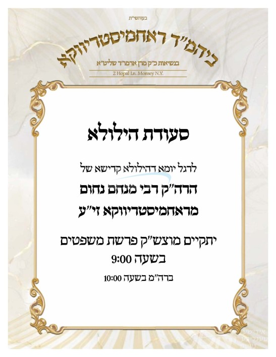 היינט כ"ח שבט געפאלט די יומא דהילולא קדישא פון הרה"ק רבי מנחם נחום מראחמיסטריווקא זי"ע, די אייניקלעך כ"ק האדמורי"ם מראחמיסטריווקא שליט"א וועלן אפרעכטן די יארצייט טישן און מלוה מלכה'ס ברוב עם.
