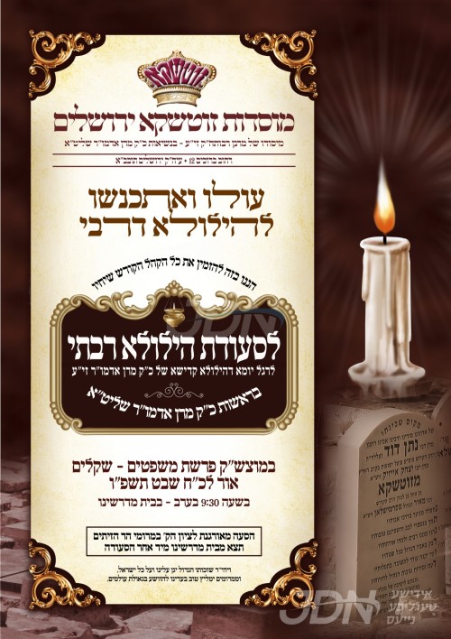 היינט קומט פאר די יערליכע מלוה מלכה לטובת ביהמ"ד זידטשויב פרעמיסלא אין מאנסי, אין זאל פון ווילחאוויץ, אין שפיץ פון כ"ק אדמו"ר מזידטשויב פרעמיסלא שליט"א.