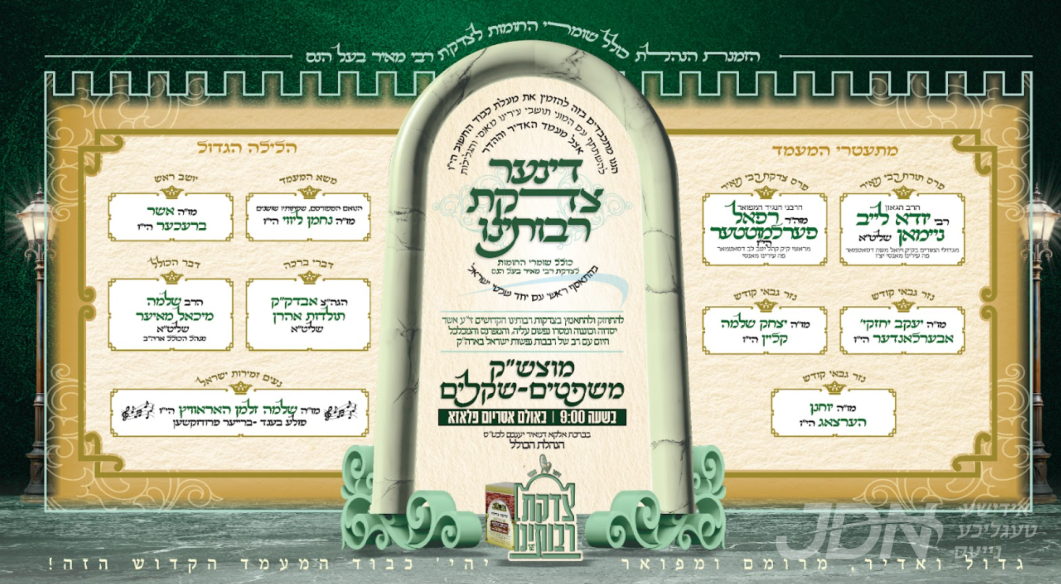 היינט קומט פאר די יערליכע דינער אין מאנסי לטובת כולל שומרי החומות לצדקת רבי מאיר בעל הנס, אין זאל פון אטריום פלאזא, אין שפיץ פון די אדמור"י ורבני העיר.