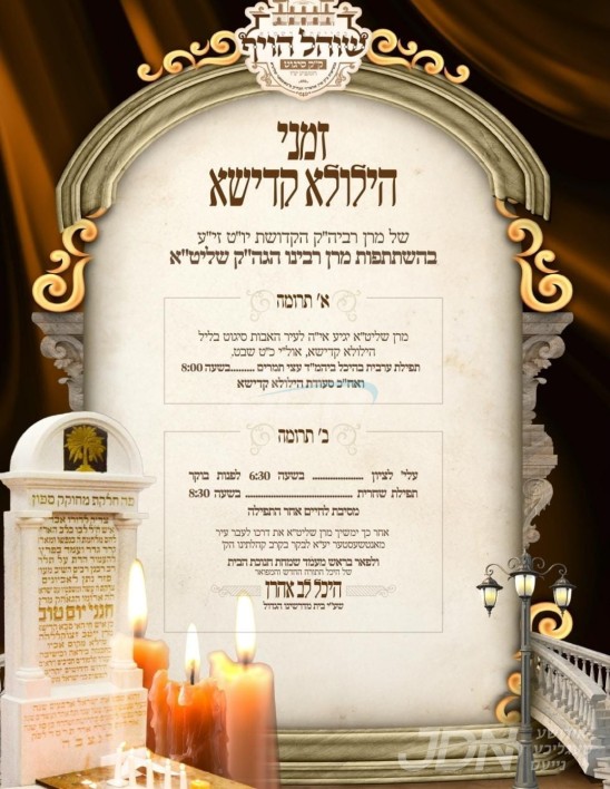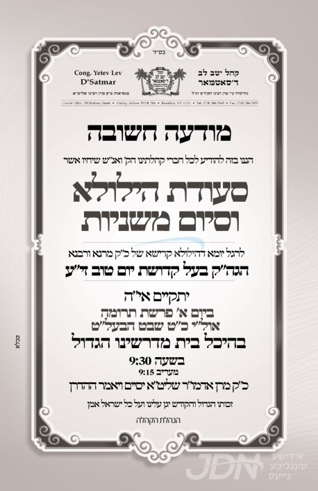 כ"ק אדמו"ר מסאטמאר שליט"א וועט היינט אויפדערנאכט אפרעכטן די יארצייט טיש און סיום משניות לרגל די יומא דהילולא קדישא פון זקינו הרה"ק בעל קדושת יום טוב מסיגעט זי"ע, אין ביהמ"ד הגדול סאטמאר אויף ראדני סטריט אין וויליאמסבורג.