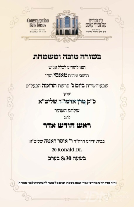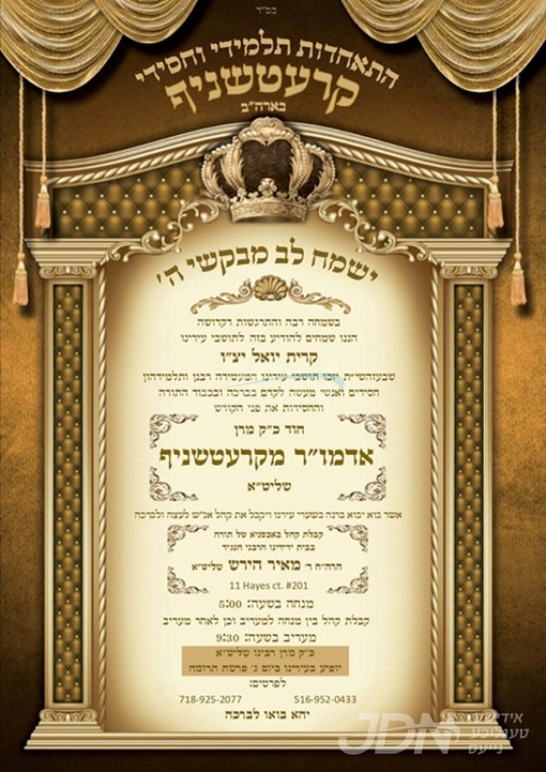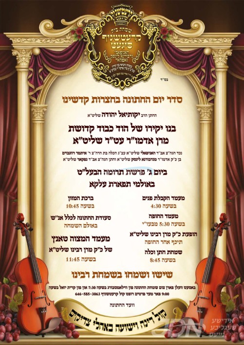 שמחת בית קרעטשניף סיגעט – נדבורנא לינסק: היינט קומט פאר די שמחת החתונה פונעם חתן א זון פון כ"ק אדמו"ר מקרעטשניף סיגעט וומס"ב שליט"א, אייניקל פון הגה"צ ר' מאיר שנעעבאלג שליט"א אב"ד האניפאלי, מיט די כלה א טאכטער פון הגה"צ ר' איתמר ראזענבוים שליט"א, זון פון כ"ק אדמו"ר מנדבורנא לינסק שליט"א, און איידעם ביי הגה"צ אב"ד נאפקור שליט"א. – די שמחת החתונה קומט פאר אין זאל תפארת עלקא אין מאנסי.