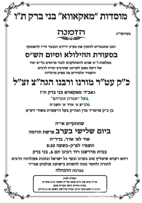 היינט נאכט א' אדר געפאלט די יארצייט פון הגה"צ ר' אברהם יחיאל לעמבערגער זצ"ל אבד"ק מאקאווא בני ברק, א יארצייט סעודה קומט פאר היינט אין מאקאווא ביהמ"ד אויף רחוב רבינו תם אין בני ברק.