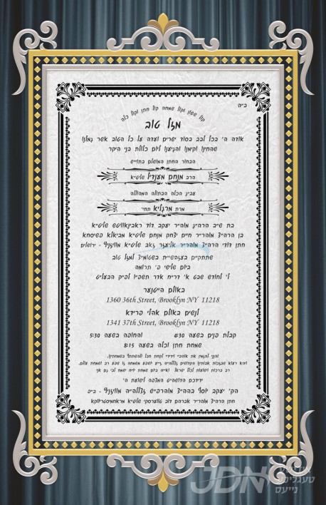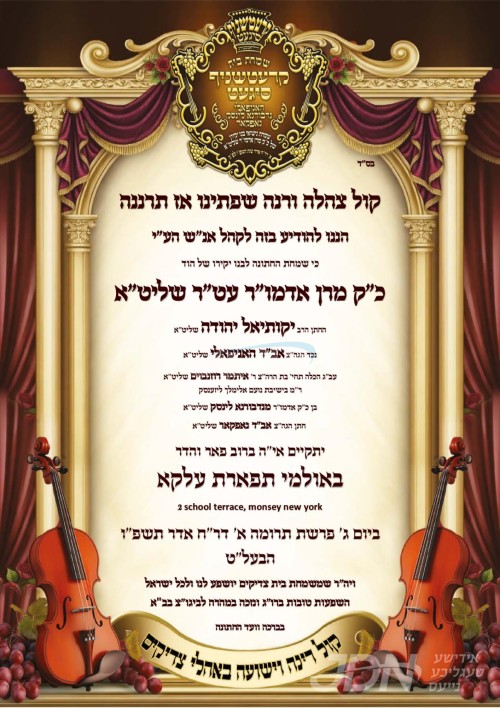 היינט קומט פאר די שמחת החתונה פונעם חתן א זון פון הגה"צ ר' שלמה פרענקל שליט"א אבד"ק וויעליפאלי לעיקוואד, זון פון כ"ק אדמו"ר מוויעליפאלי שליט"א, און איידעם ביי כ"ק אדמו"ר מזידטשויב שיקאגא זצ"ל, מיט די כלה א טאכטער פון הגה"צ ר' חיים יצחק גרובער שליט"א אבד"ק זכרון יואל יאס לעיקוואד, איידעם ביי הגה"צ ר' יעקב שרגא הורוויץ שליט"א אבד"ק זרע קודש וראש ישיבת בית מאיר. – די שמחת החתונה קומט פאר אין זאל עטרת גינענדל אין לעיקוואד.