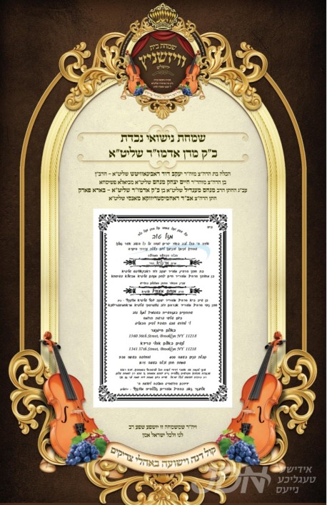 שמחת בית וויזניץ: היינט קומט פאר די שמחת החתונה פונעם חתן א זון ביי כ"ק אדמו"ר מוויזניץ שליט"א פון בארא פארק, איידעם ביי הגה"צ אבד"ק ראחמיסטריווקא מאנסי שליט"א, מיט די כלה א אייניקל פון כ"ק אדמו"ר מוויזניץ שליט"א פון ירושלים, א טאכטער פון זיין איידעם הגה"צ ר' יעקב דוד ראבינאוויטש שליט"א, זון פון כ"ק אדמו"ר מביאלא פשיסחא שליט"א. – די שמחת החתונה קומט פאר אין די הייטנער זאל אין בארא פארק.