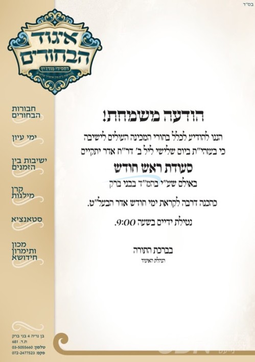 כ"ק אדמו"ר ממודזיץ שליט"א וועט היינט אויפדערנאכט אפרעכטן שולחנו הטהור לכבוד ראש חודש, געאייגענט פאר די בחורים פון מכינה לישיבה דחסידי מודזיץ וואס גרייטן זיך אריינצוגיין לערנען בין כותלי הישיבה.
