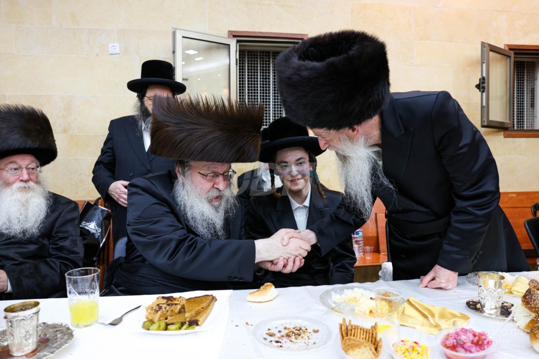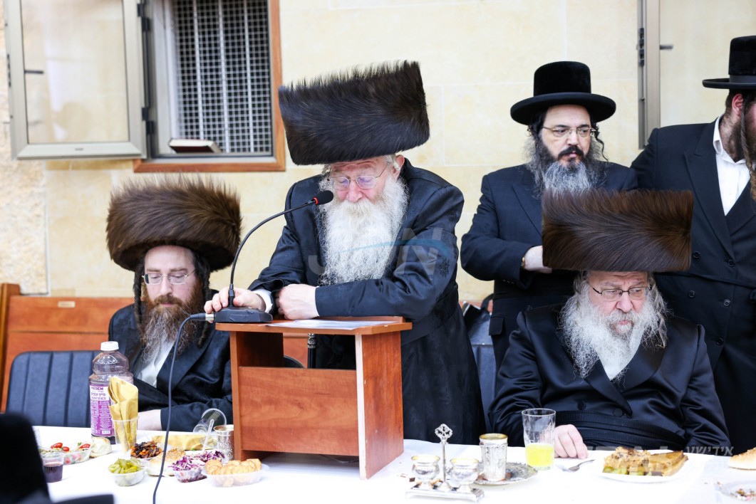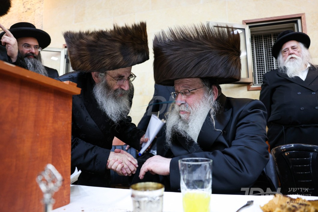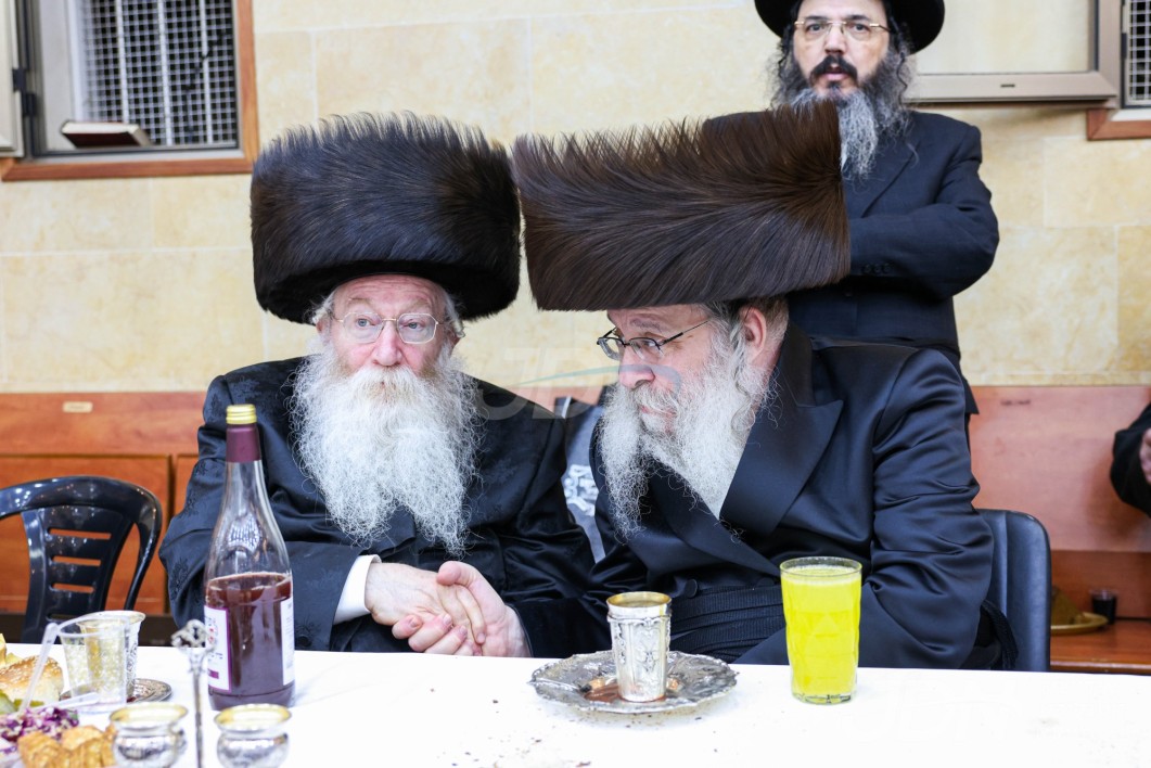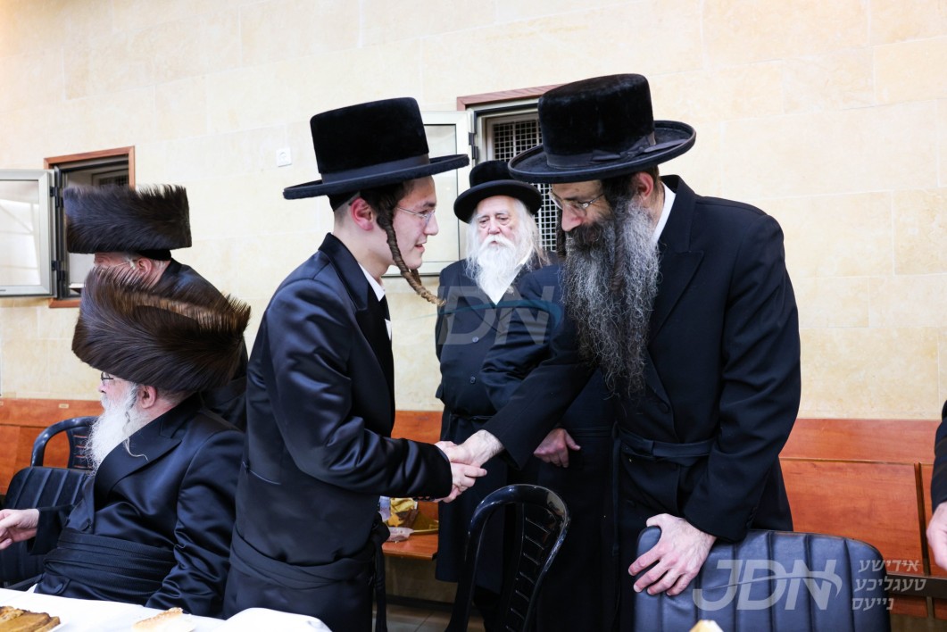 שמחת התנאים פון הכלה בת אב"ד סיגוט און אייניקל פון האדמו"ר מסאטמאר מיט החתן אייניקל פון האדמו"ר מספינקא און אב"ד פאפא ב"פ