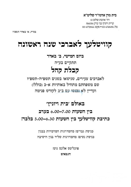 אצינד איז געמאלדן געווארן אז דער רבי שליט"א וועט אריינקומען קיין בני ברק ספעציעל צו אויפנעמען די אינגע אינגעלייט פון שנה ראשונה, די וואס האבן חתונה געהאט אין די לעצטע יאר צייט און האבן נאכנישט געהאט די געלעגנהייט אריינצוגיין מיט א קוויטל אינאיינעם מיט די בני בית, די זמני קבלת קהל וועט פארקומען מארגן דאנערשטאג נאכמיטאג אין זאל פון בית וויזניץ אין שיכון וויזניץ בני ברק, צוערשט פאר די אינגעלייט וואס זייער נאמען הייבט זיך אן מיט די אותיות פון א' ביז כ', און ביי א קומענדיגע געלעגנהייט וועלן די אנדערע אינגעלייט קענען אריינגיין אל הקודש פנימה.
