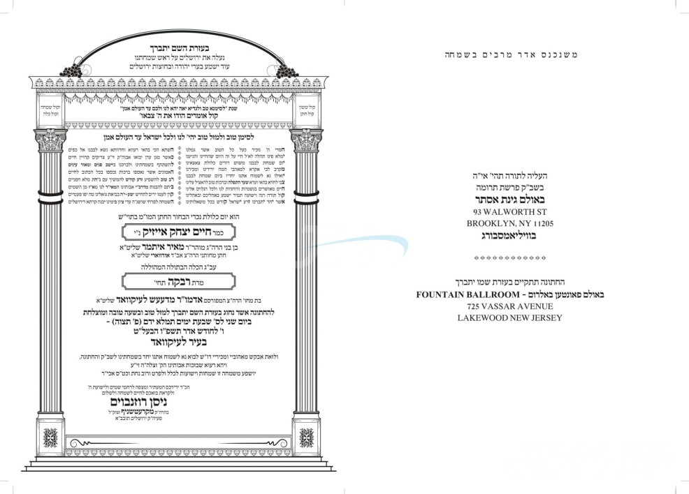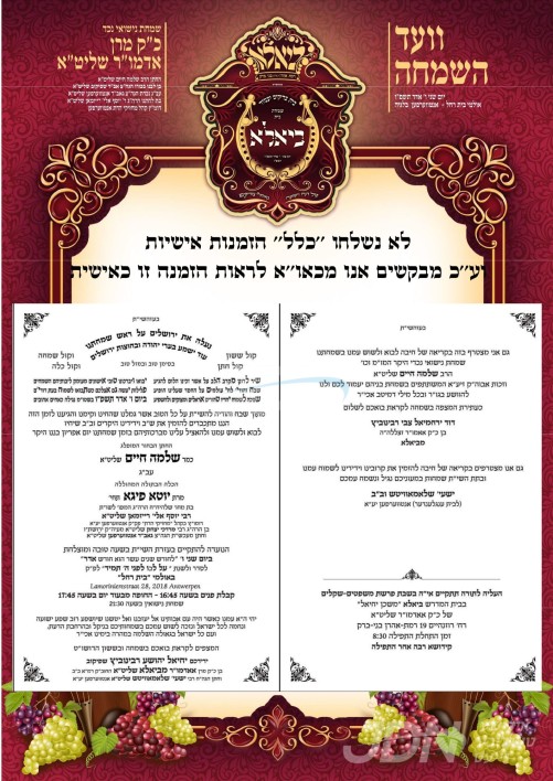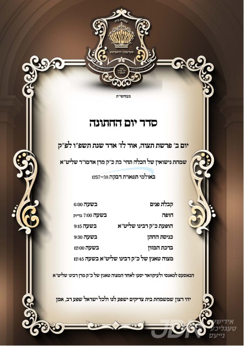 היינט קומט פאר די שמחת החתונה פונעם חתן א זון פון הרב יחיאל זעליג מענדלאוויטש שליט"א, זון פון הגה"צ אבד"ק חאליוב שליט"א, און איידעם ביי הגה"צ ר' יעקב האניג שליט"א מקאזעווע, מיט די כלה א טאכטער פון הגה"צ ר' ישראל דוד ביק שליט"א אבד"ק נחלת משה ראוונע ב"פ, איידעם ביי הגה"צ ר' יצחק ראבינאוויטש שליט"א מרבני באיאן וומס"ב, איידעם ביי הגה"צ אבד"ק טשענגער זצ"ל. – די שמחת החתונה קומט פאר אין זאל אור החיים וויזניץ אין בארא פארק.