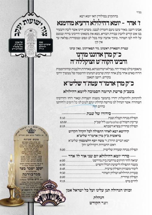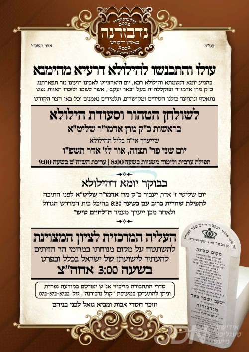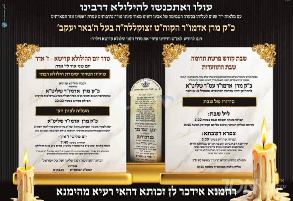 היינט נאכט ז' אדר געפאלט די יומא דהילולא קדישא פון כ"ק אדמו"ר מנדבורנא זצ"ל בעל באר יעקב, די קינדער כ"ק האדמורי"ם מנדבורנא שליט"א וועלן אפרעכטן די יארצייט טישן ברוב עם און פוקד זיין דעם ציון הק' אינאיינעם מיט די חסידים אויפן הר הזיתים.