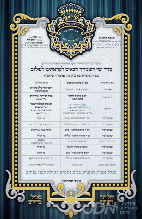 שמחת בית קרעטשניף – אודווארי – דעעש: היינט קומט פאר די שמחת החתונה פון א אייניקל ביי כ"ק אדמו"ר מקרעטשניף י"ם שליט"א, די חתן א זון פון זיין זון הגה"צ ר' מאיר איתמר ראזענבוים שליט"א, איידעם ביי הגה"צ אבד"ק אודווארי שליט"א, מיט די כלה א טאכטער פון הגה"צ ר' משה פאנעט שליט"א אבד"ק דעעש לעיקוואד, איידעם ביי הגה"צ ר' מרדכי בצלאל קליין שליט"א אבד"ק סאטמאר לעיקוואד. – די שמחת החתונה קומט פאר אין זאל פאונטען באללרום אין לעיקוואד.